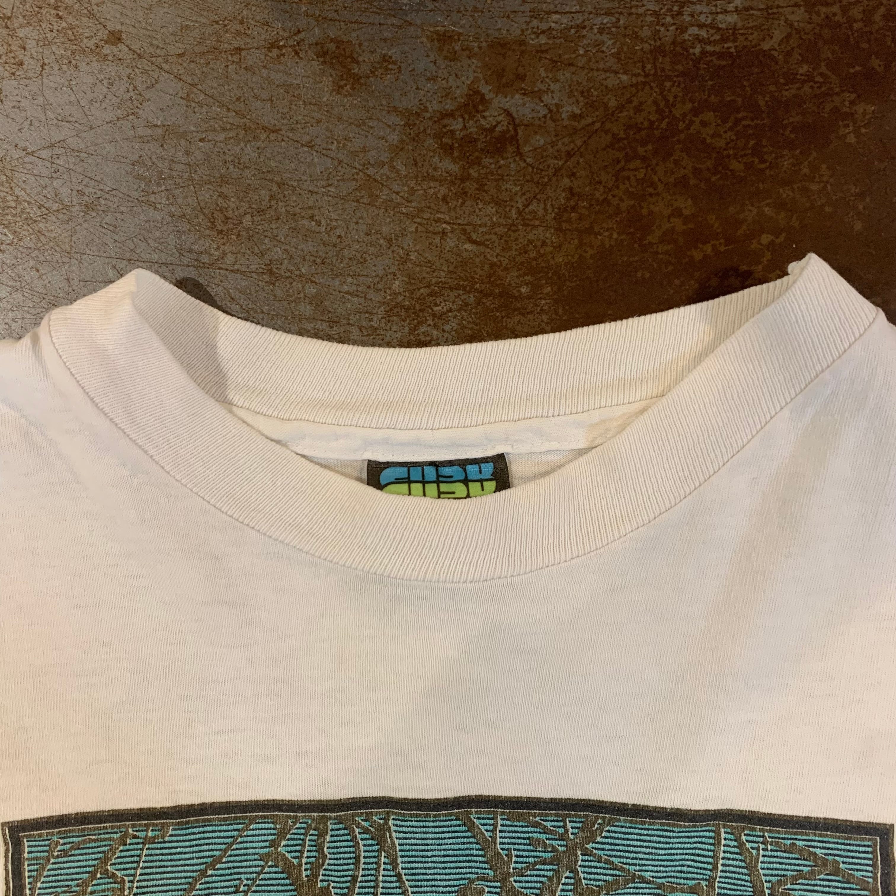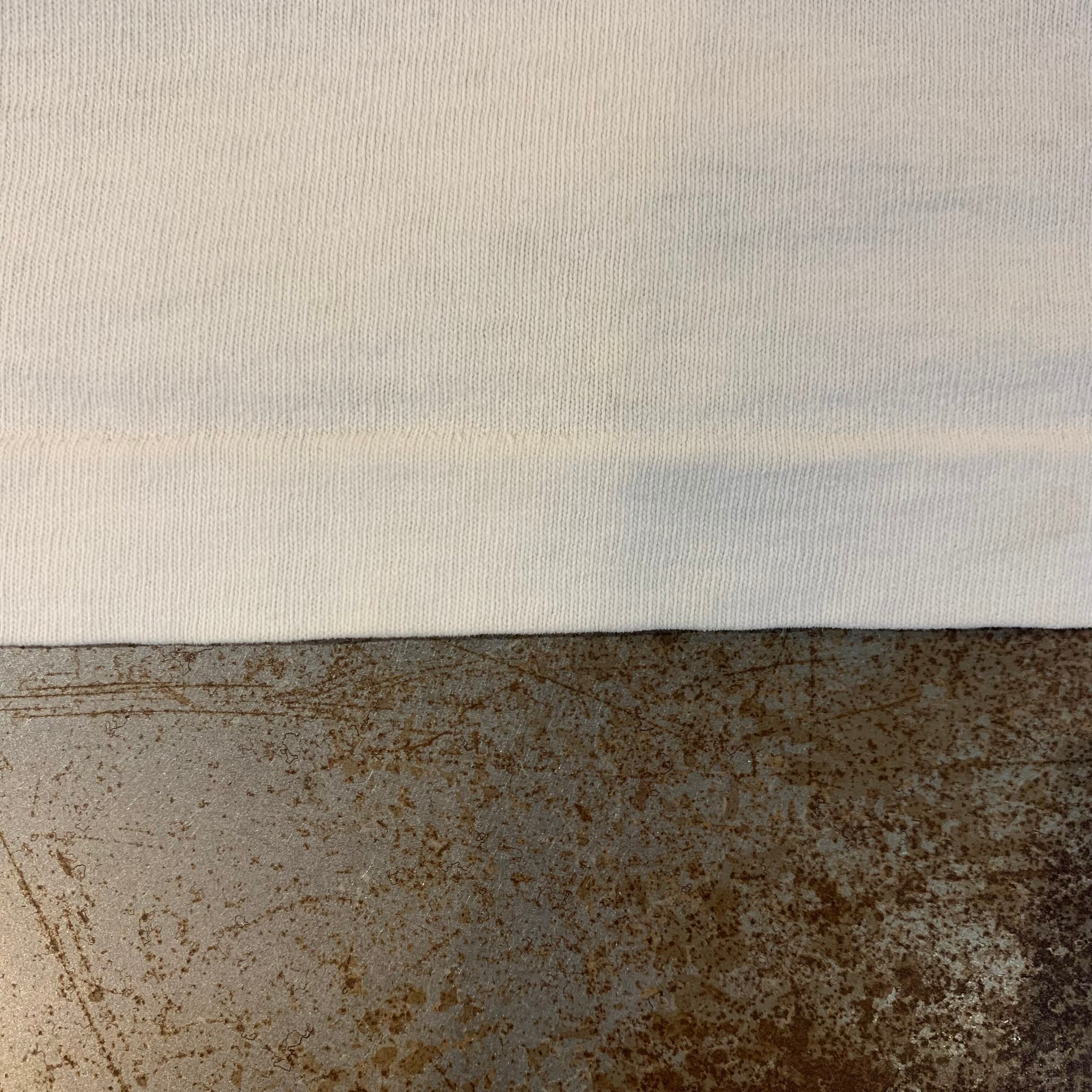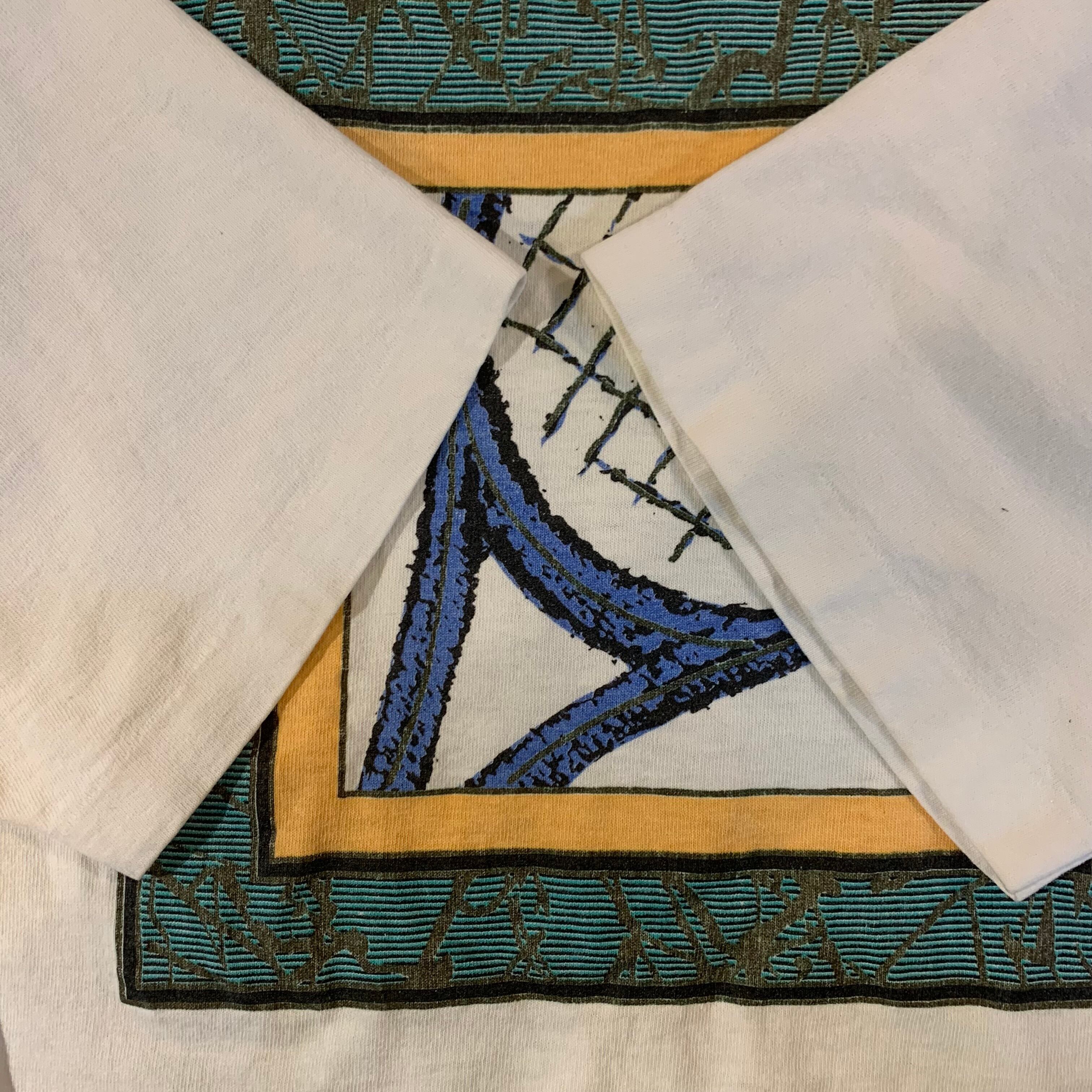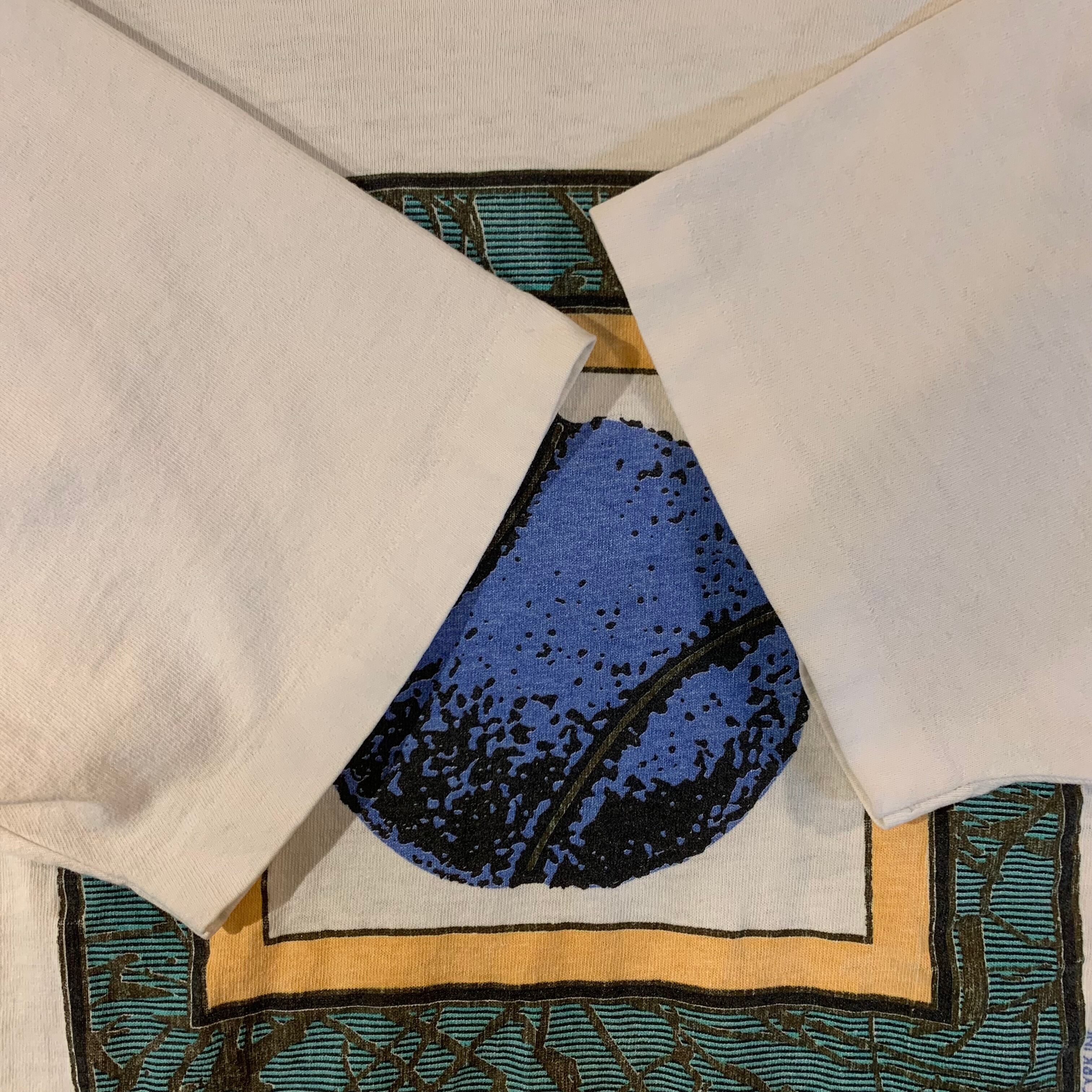 左袖に汚れと穴あき、前面下部にシミ、襟の縫い目にピンホールがありますが、プリントの状態は綺麗で風合いがあります。